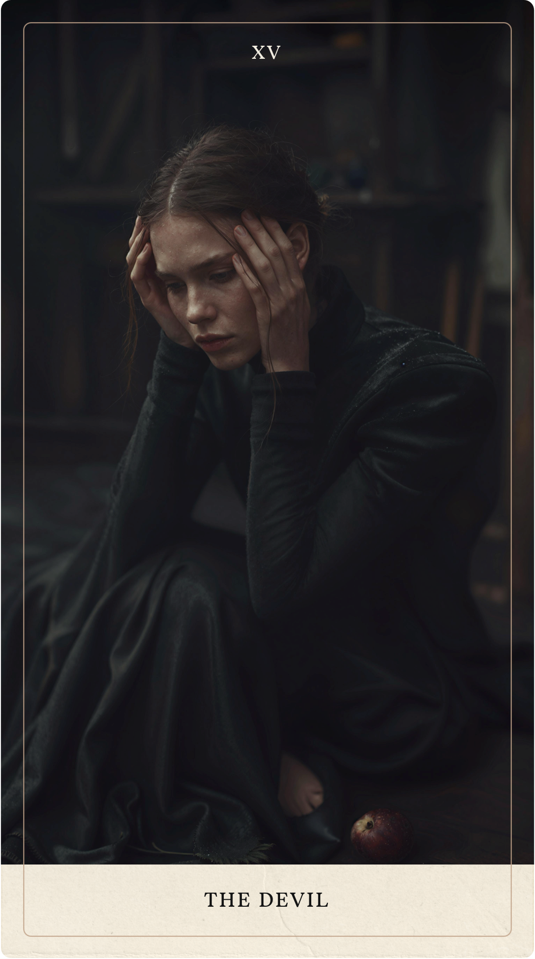 Rano wyciągasz jedną kartę. Czytasz Jasność — to, co w tej karcie jest widoczne w Twoim dniu. Gdy jesteś gotowa, otwierasz Cień — to, co ta sama karta pokazuje w tym, co w sobie tłumisz. Złoty Cień otwiera się następnego dnia.